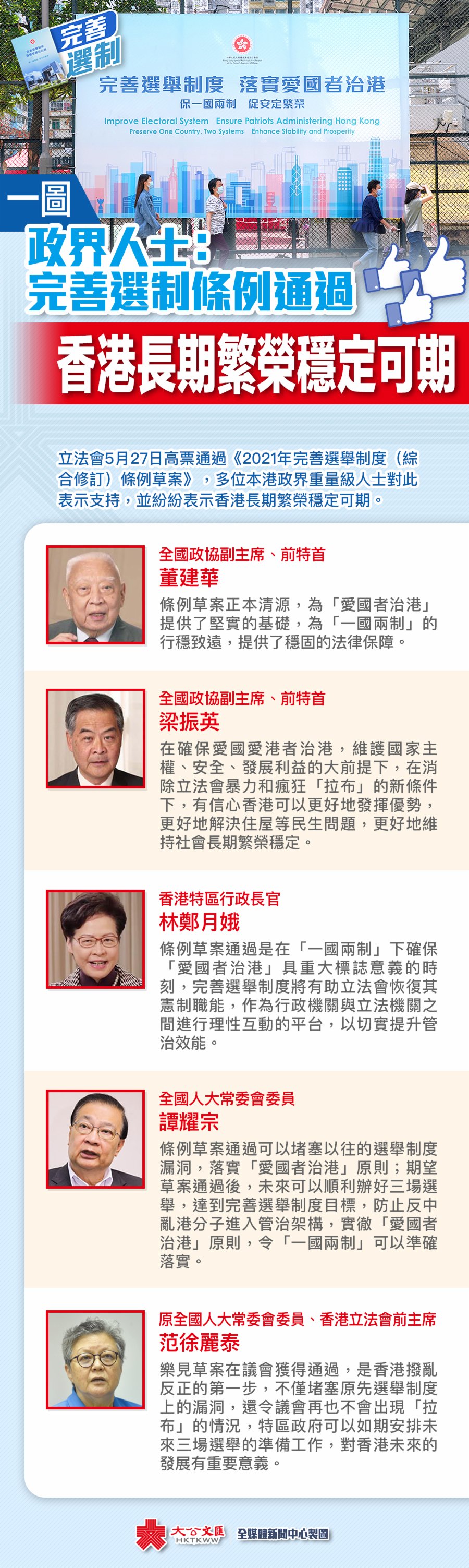大公文匯全媒體報道,立法會5月27日高票通過《2021年完善選舉制度(綜合修訂)條例草案》,多位本港政界重量級人士對此表示支持,並紛紛表示香港長期繁榮穩定可期。