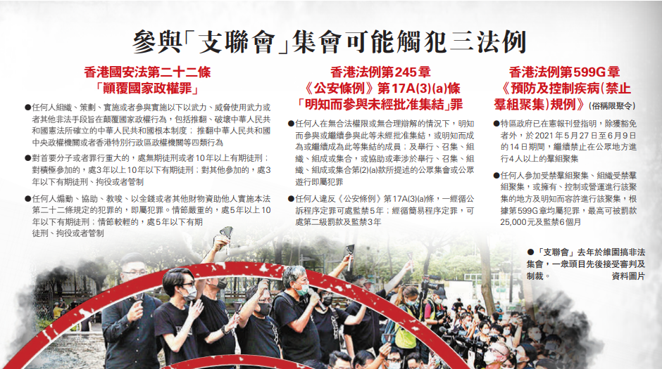 大公文匯全媒體報道,警方昨日(27日)正式向「支聯會」的兩項活動申請發出反對通知書,包括禁止「支聯會」本月30日舉行遊行集會以及在6月4日在維園舉行集會。「支聯會」就此上訴,公眾集會及遊行上訴委員會明日(29日)上午9時半舉行聆訊,就警方向「支聯會」發出的反對通知書內容而提出的上訴進行聆訊。今次聆訊的主席為陳耀莊,聆訊在金鐘統一會議中心舉行。