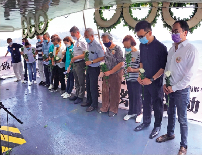 (大公報實習記者 鍾怡)雪白的菊花瓣在海波上飄漾,嘹亮的歌聲在海風中唱響,一曲《歌唱祖國》在此時此刻,尤為激盪人心催人淚下。昨日在香港龍鼓灘、沙洲兩個小島附近的海面上,香港多個民間團體舉辦劉春祥抗日英雄犧牲78周年紀念活動,逾百名各界人士到場參加。著名香港史專家劉蜀永教授說:「這次海祭體現出港人對國家、對民族的認同感,也是傳承前輩愛國精神的體現」。