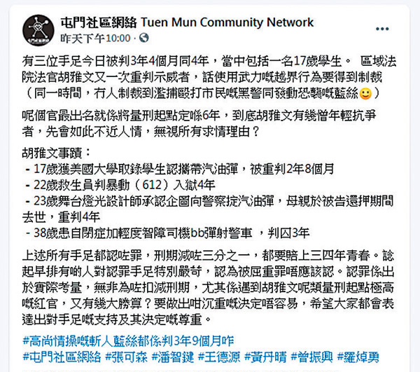 胡雅文過去曾審理多宗與黑暴及香港國安法有關的案件,包括涉及黎智英等攬炒政棍的「8·18」和「8·31」非法集結案,並將黎智英、李卓人等人判囚。她本周五審理「十一」非法集結時,判處黎智英等10名被告監禁14個月至18個月不等。