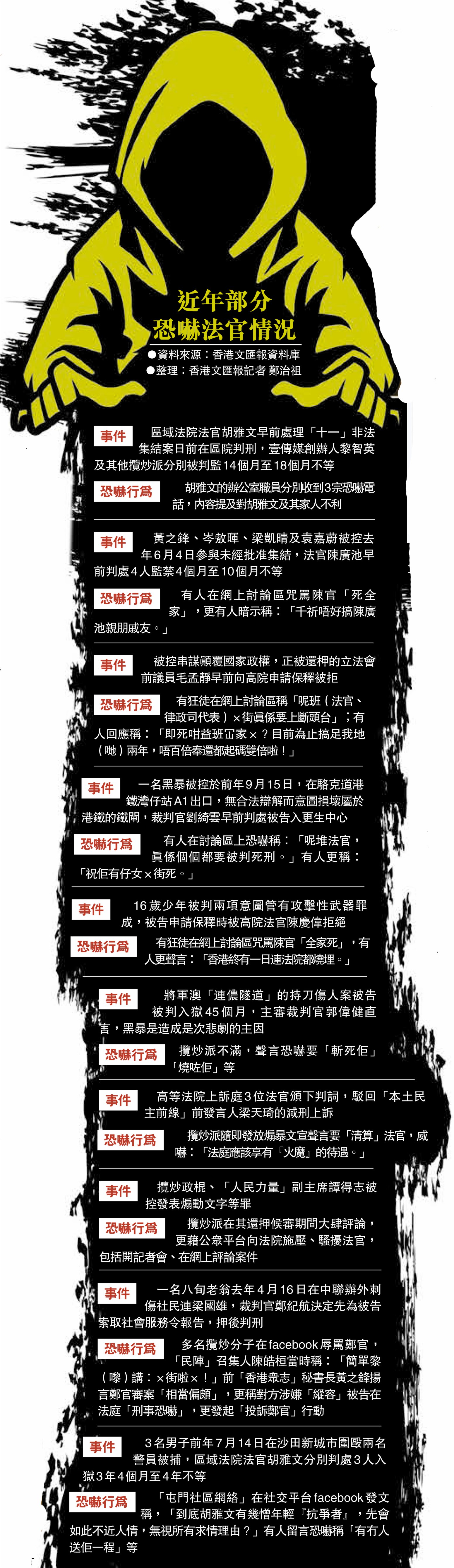今次被恐嚇的胡雅文,正是前述兩宗非法集結案的主審法官。大律師公會昨日對胡官三度接獲恐嚇電話發表聲明,強烈譴責相關恐嚇行為,表示法官須在不受任何干涉的情況下履行司法職責,對司法人員作出威脅,企圖向法官施加壓力或影響法官的裁決,均嚴重衝擊司法獨立。該等行為不但干預司法運作,亦損害香港法治,強調上述行為在法治社會中絕對不能姑息,必須立即停止。