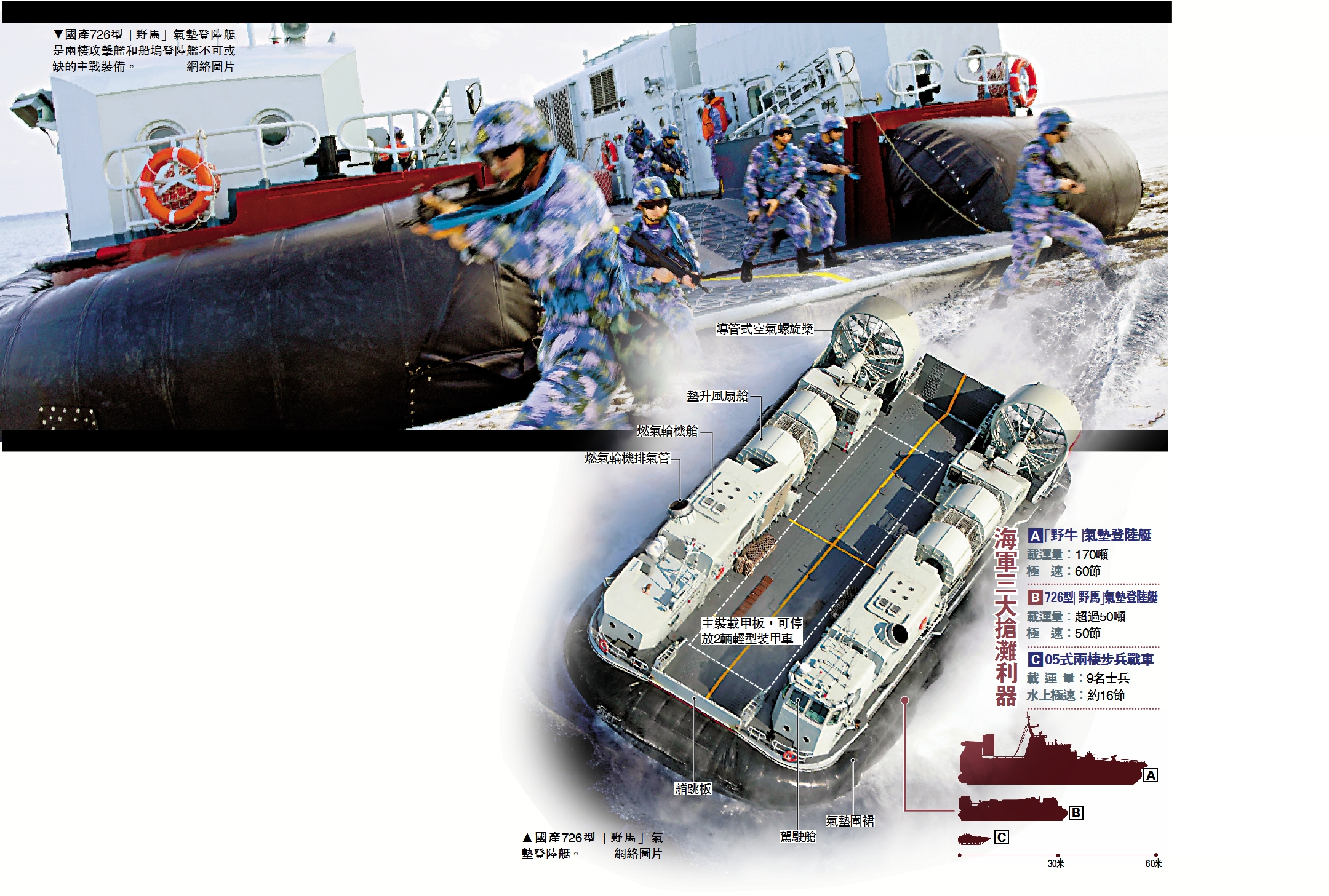 (大公報記者 馬浩亮)075型兩棲攻擊艦首艦海南艦今年4月服役,與071型船塢登陸艦共同支撐起解放軍立體化登陸作戰的核心體系,它們列裝的國產726型「野馬」氣墊登陸艇,具有航速快、通過性能強、精度高等特點。該氣墊艇強大的墊升力使其幾乎懸浮在水面上「打水漂」,劈波斬浪,跨越障礙,快速將主戰坦克、兩棲裝甲戰車等重型裝備和作戰人員運送上岸,迅速形成陸上重裝火力網,成為海軍三大艦隊登陸支隊的攻擊尖刀。