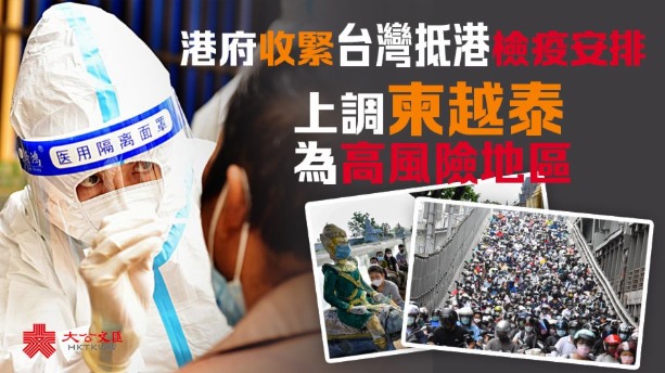 大公文匯全媒體報道,食物及衞生局長陳肇始今日(31日)宣布,即日起將收緊台灣抵港人士檢疫安排,如未完成接種疫苗要檢疫21日,已接種疫苗人士須檢疫14日;將柬埔寨、越南及泰國,納入為高風險指明地區,由這些地方到港的人士,如果未接種疫苗要強制檢疫21日,如果已接種疫苗,就可強制檢疫14日後,進行7日自行監察;因應英國疫苗接種率持續提高,早前取消英國登機限制後,未發現相關輸入個案,政府亦將英國由甚高風險地區下調至高風險地區。