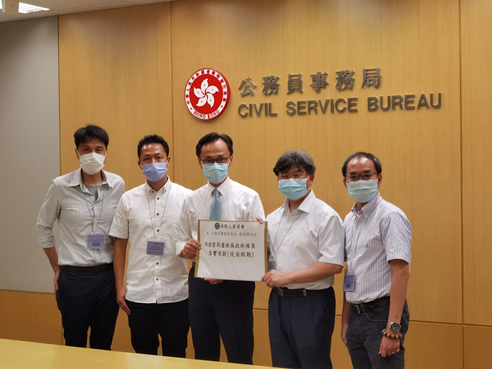 聶德權在會上表示,5月31日或之前接種疫苗的政府僱員,可於明年3月31日前就每針申請一日假期。馬志成表示,政府人員協會早於5月13日已聯同工聯會立法會議員郭偉强於約見聶局長,首先提出疫苗假期的安排,協會隨後向2199名會員做問卷調查,其中1228人已接種1、2劑或已預約接種疫苗,未接種的會員中,有239人表示如設立有薪「疫苗假期」則願意接種。問卷顯示,假如為員工提供疫苗假期,可加快提高約11%接種率,為局方帶來有力數據支撐向員工提供疫苗假期。