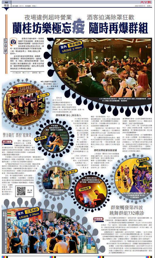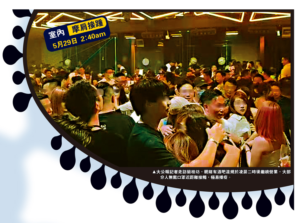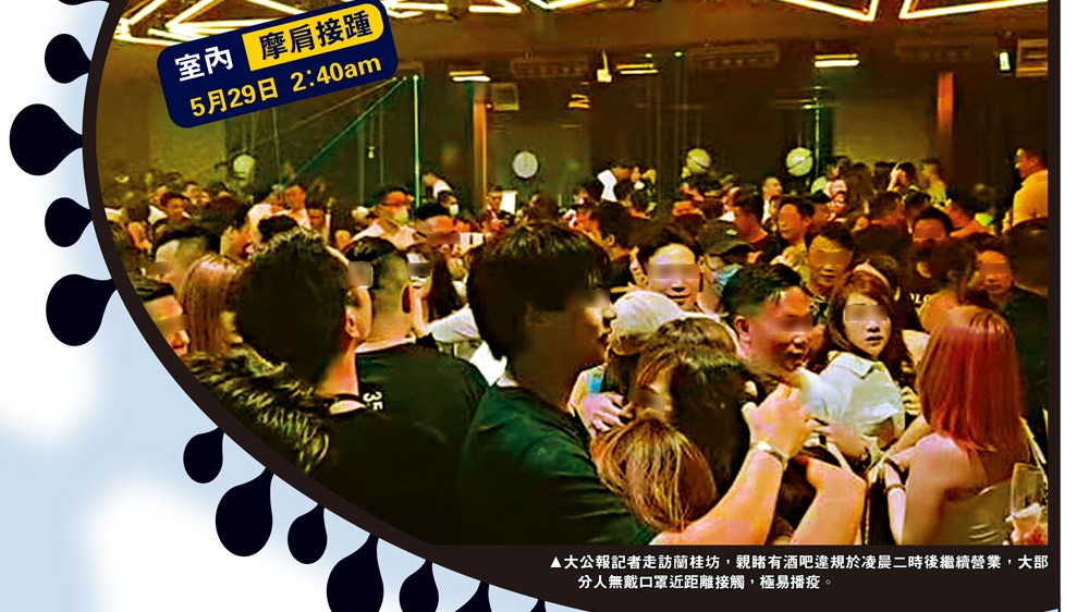 去年曾先後涉及酒吧群組、跳舞群組的蘭桂坊,卻有夜店無視禁令,越夜越精彩,有「蒲友」通宵達旦除罩狂歡,夜店至凌晨三時仍繼續做生意,限聚令形同虛設,隨時再爆發染疫群組,為防止第五波爆發的抗疫工作帶來極大隱患。
