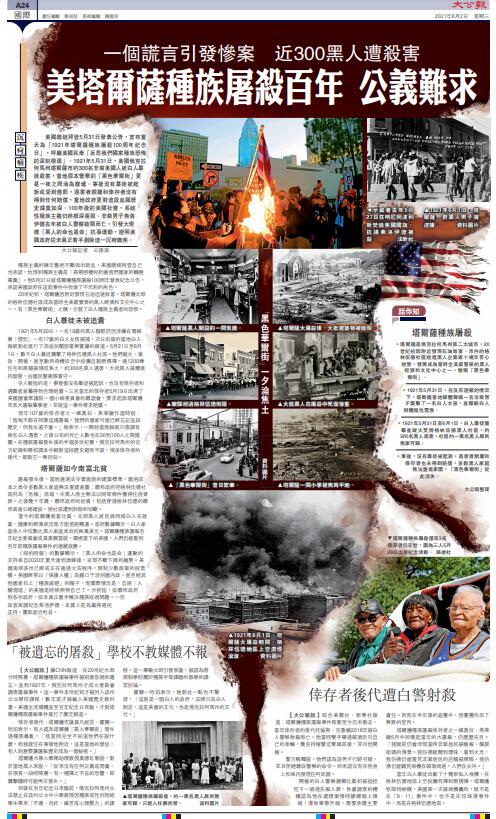(大公報記者 公孫淑)美國總統拜登5月31日發表公告,宣布當天為「1921年塔爾薩種族屠殺100周年紀念日」,呼籲美國民眾「反思我們國家種族恐怖的深刻根源」。1921年5月31日,美國俄克拉何馬州塔爾薩市約300名非裔美國人被白人暴徒殺害,當地原本繁華的「黑色華爾街」更是一夜之間淪為廢墟。事後沒有暴徒被起訴或受到懲罰,遇害者親屬和倖存者沒有得到任何賠償,當地政府更對這段血腥歷史諱莫如深。100年後的美國社會,系統性種族主義仍然根深蒂固。非裔男子弗洛伊德去年被白人警察跪頸而亡,引發大規模「黑人的命也是命」抗爭運動,證明美國政府從未真正着手剷除這一沉疴痼疾。