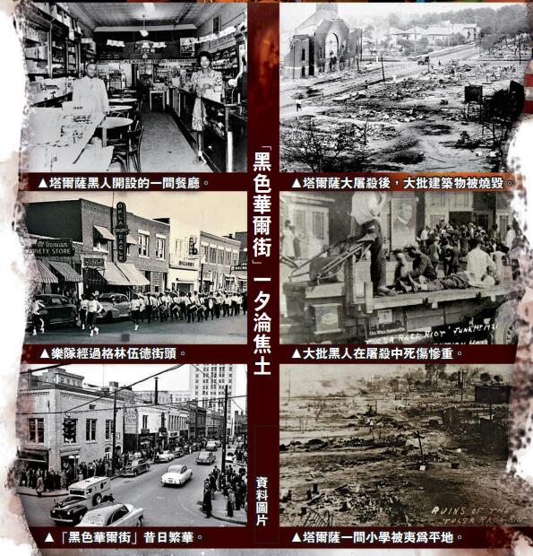 1921年5月30日,一名19歲的黑人擦鞋匠因涉嫌在電梯裏「侵犯」一名17歲的白人女孩被捕,次日出版的當地白人報紙對此進行了添油加醋卻毫無實據的報道。5月31日至6月1日,數千白人暴徒襲擊了格林伍德黑人社區。他們縱火、搶劫、開槍,甚至動用飛機從空中投擲自製燃燒彈。逾1200棟住宅和商舖被燒成焦土,約300名黑人遇害,大批黑人被關進拘留營,由國民警衛隊看守。