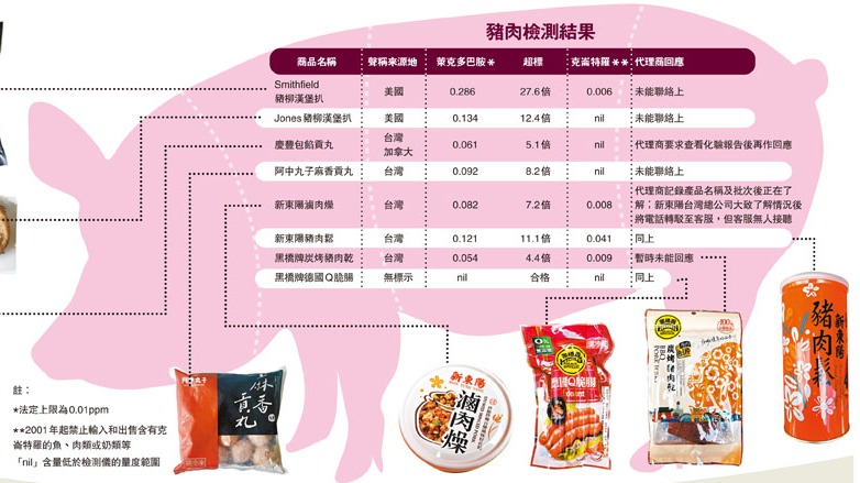 檢測結果發現,除了「黑橋牌德國Q脆腸」未檢到萊克多巴胺,其餘7款全部超出香港法例標準,超標最勁的產品是美國「Smithfield豬柳漢堡扒」,超標27.6倍;台灣產品的超標水平介乎4.4至11.1倍,最嚴重的是「新東陽豬肉鬆」。