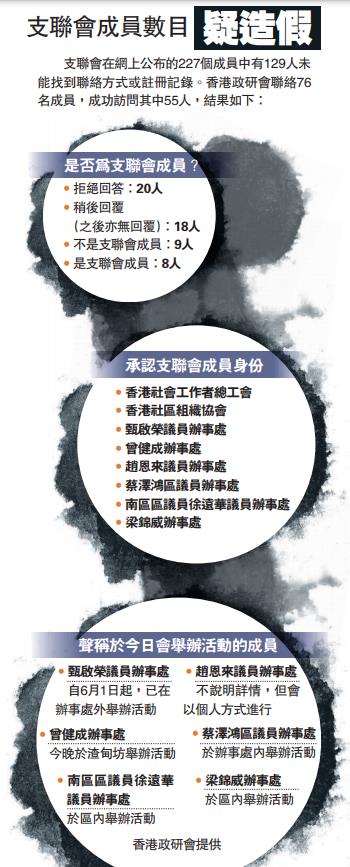 香港政研會於5月31日至6月2日,根據支聯會曾在網上公布的227個團體、社團或個人成員名單嘗試聯絡,結果發現,其中129名成員無法查詢到任何聯絡辦法,亦未有公司或社團註冊信息。香港政研會最終聯絡到76個成員,並成功訪問其中的55人,然而承認自己是支聯會成員僅有八個。