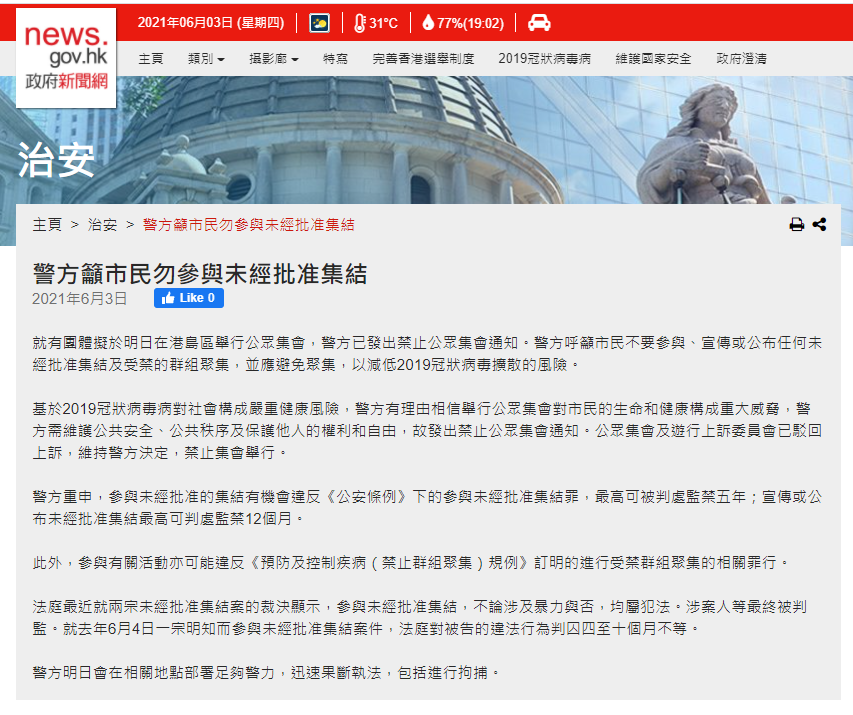 此外,參與有關活動亦可能違反《預防及控制疾病(禁止群組聚集)規例》(第599G章)訂明的進行受禁群組聚集的相關罪行。警方呼籲市民不要參與、宣傳或公布任何未經批准集結及受禁的群組聚集,並應避免聚集,減低病毒擴散的風險。警方當日會在相關地點部署足夠警力,迅速果斷執法,包括進行拘捕。