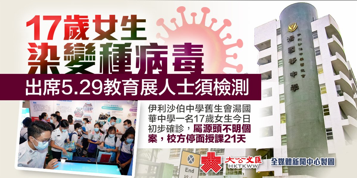 此外,消息指伊利沙伯中學舊生會湯國華中學一名17歲女學生初步確診,疑感染源頭不明,並驗出帶有N501Y變種病毒,或曾訪第27屆香港國際教育展。她最後一次回校日期為6月2日,學校今日至6月24日停止面授課21天。