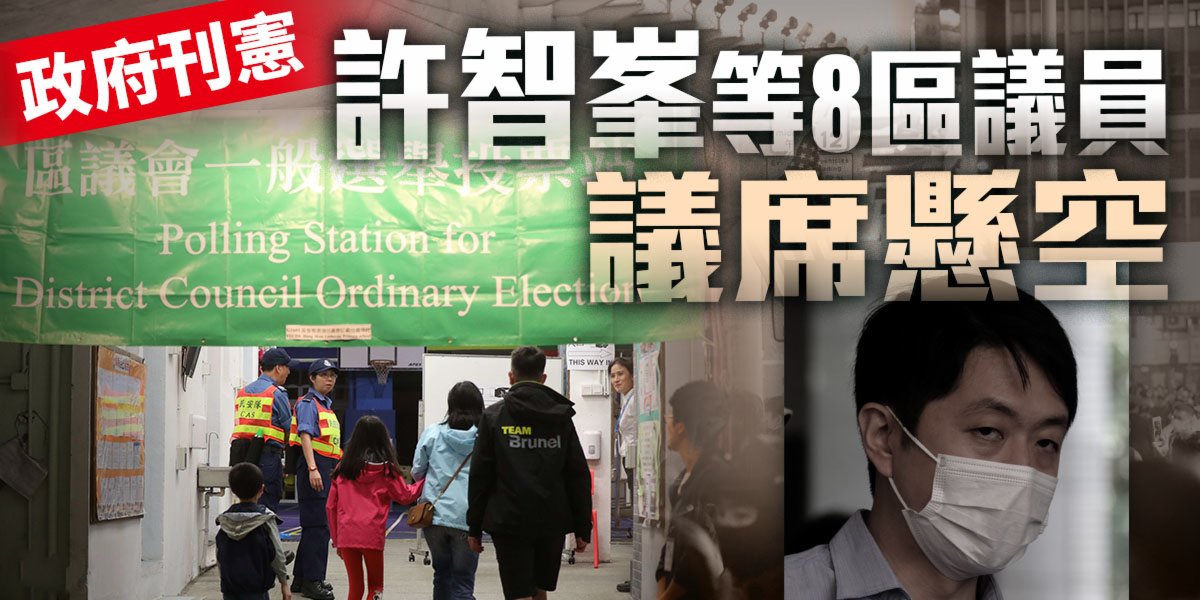 政府今日在憲報刊登公告,宣布8名區議員議席懸空。其中棄保潛逃的前民主黨成員、中西區區議員許智峯,自今年1月28日起連續缺席中西區區議會的所有會議,亦沒有在喪失資格限期完結前取得中西區區議會的有關同意,根據《區議會條例》,許智峯在5月29日喪失議員資格,其議席亦由當日起懸空。