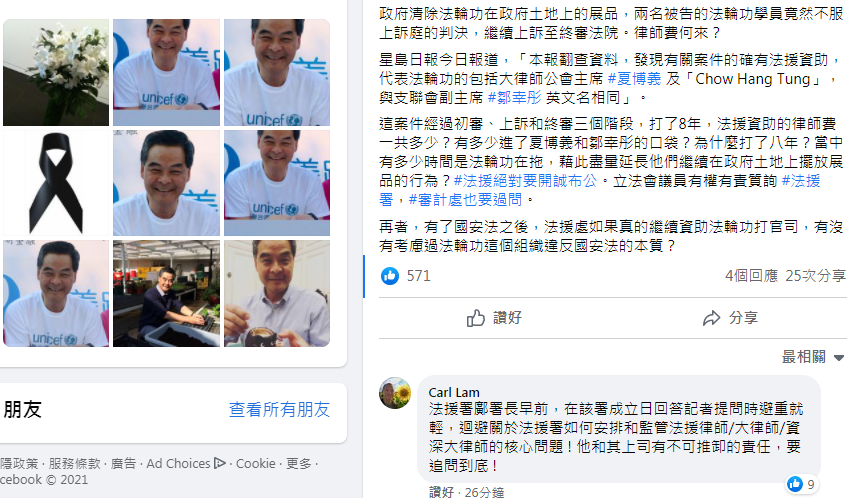 梁振英質疑,這案件經過初審、上訴和終審三個階段,打了8年,法援資助的律師費一共多少?有多少進了夏博義和鄒幸彤的口袋?為什麼打了八年?當中有多少時間是法輪功在拖,藉此盡量延長他們繼續在政府土地上擺放展品的行為?法援絕對要開誠布公。立法會議員有權有責質詢法援署,審計署也要過問。