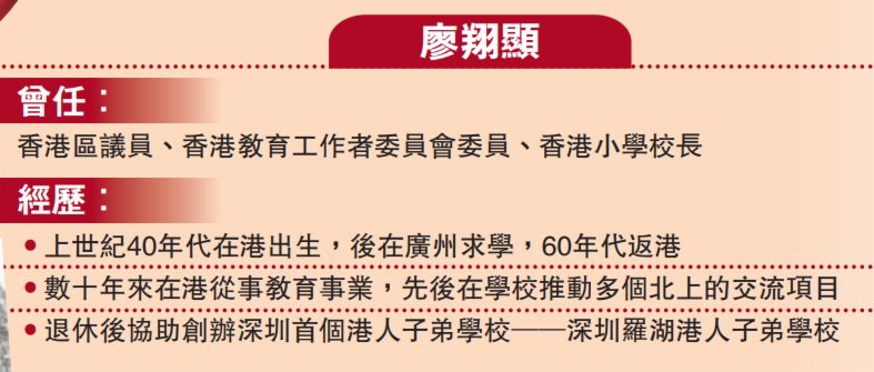 如今廣東為港人子弟提供港式課程的學校日漸增多,但20年前,港人子女內地求學一度成為困擾,於是廖翔顯北上協助創辦深圳羅湖港人子弟學校,集合兩地優勢調整課程。如今學校早已步上正軌,年事已高的廖翔顯也逐漸淡出。