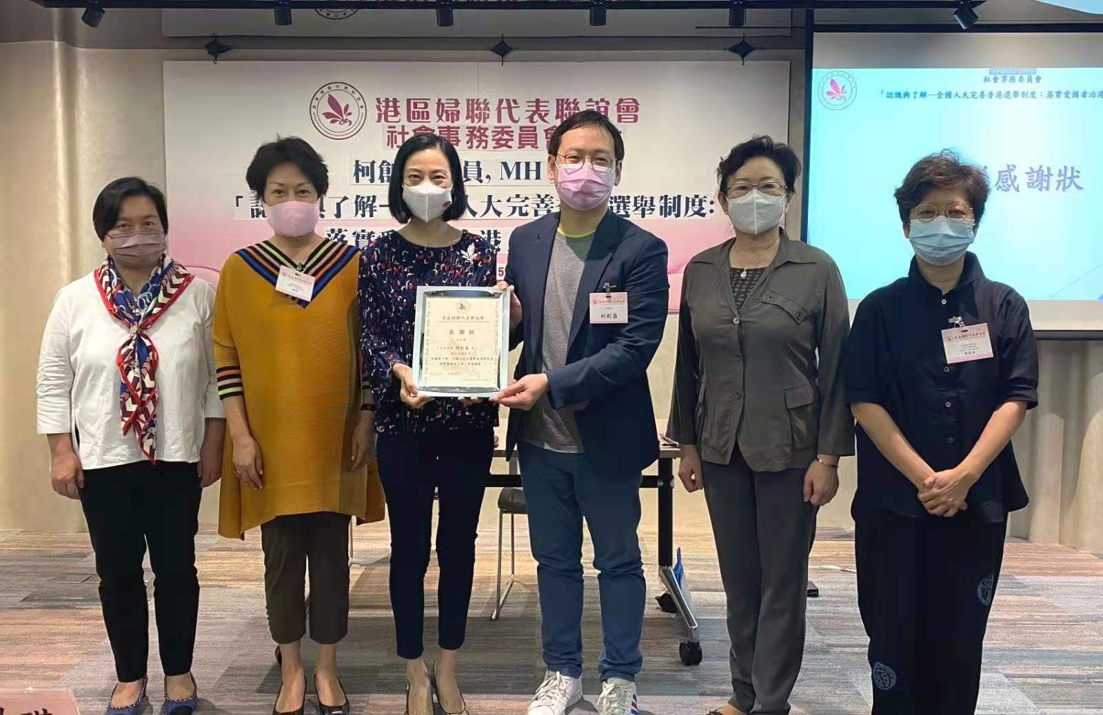 首先,社會事務委員會主管副會長徐莉女士致歡迎詞。接着,主講嘉賓柯創盛議員從香港原有選舉制度的不足、人大完善香港選舉制度的內容、未來影響等方面進行了詳實、精彩的分享,並詳細回答了姊妹們的相關提問,增進了大家對香港新選舉制度的認識和了解。講座結束後,陳曼琪會長、姜岩副會長、周莉莉副會長、徐莉副會長、何超蕸副會長一同致送感謝狀給柯議員。本次講座讓各位姊妹更加充分、全面地認識和了解香港新選舉制度和女性在政制上的重要性。