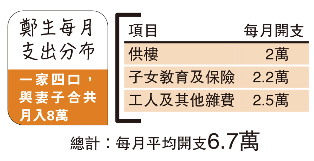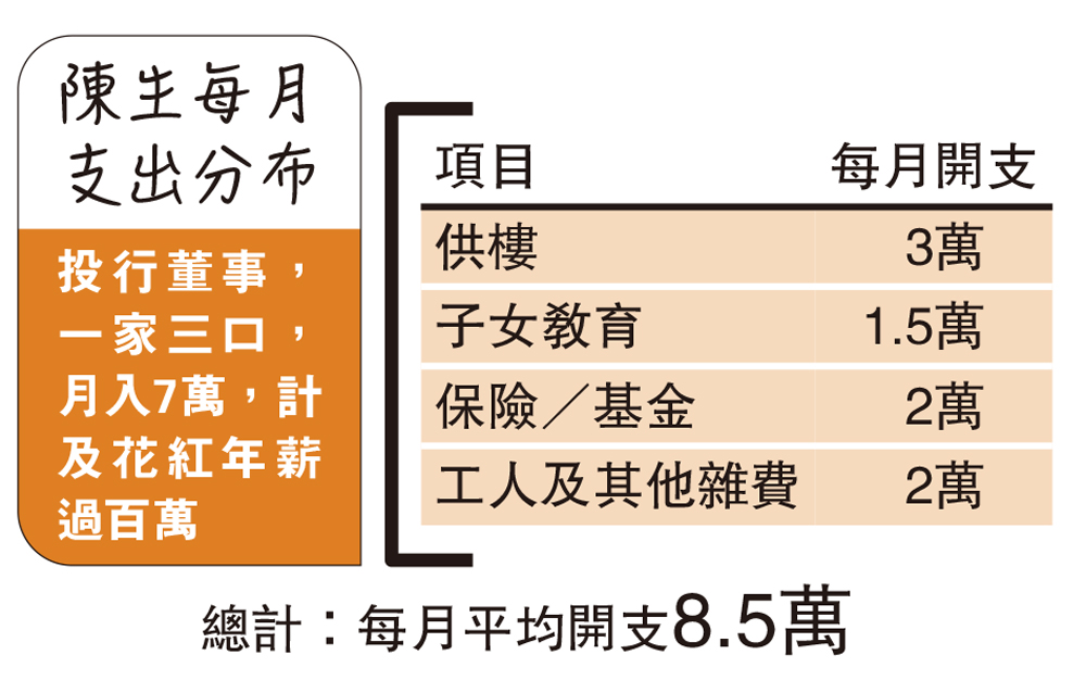 太太為全職主婦、有外傭、子女讀私立學校,是本港不少中產家庭的寫照,陳生也不例外。他向記者分享了每月開支:「最大支出是供樓,薪金差不多一半用於供樓,再加上子女教育、保險、工人及其他開支,我每月基本都是入不敷支,要靠年底花紅補貼。」