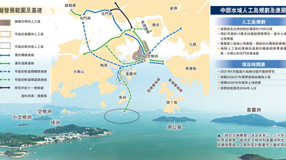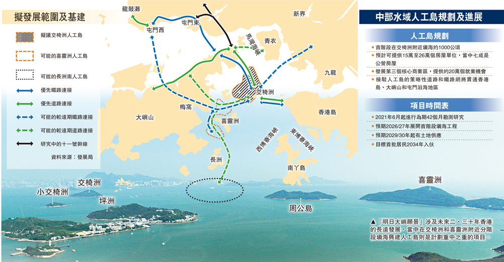 至於人工島的規劃,鍾國輝指出,中部水域勘測結果,包括水流、風浪等,將決定人工島具體選址及用地規劃,「(人工島)未必是『四四正正』,填海可以避開生態價值高的地方,亦可以在面向大嶼山、風浪較細的地方建造生態海岸線。」