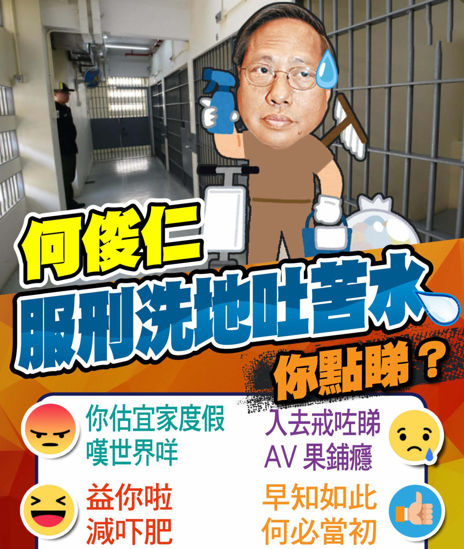 不少市民認為懲教署安排適當。服刑又不是度假,難道要每日坐在冷氣房看性感女郎的照片,才算合理安排嗎?何養尊處優多年,洗地又有何辛苦呢?有網友留言:「咁咪幾好,去減下肥。」、「順便戒掉看AV那鋪癮。」