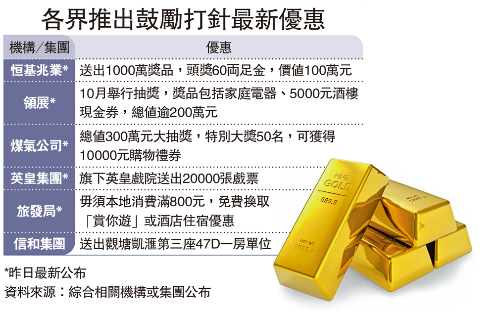 (大公報記者 馮錫雄)新冠疫苗接種計劃開打超過100天,接種率仍未達群體免疫水平,再有商界及機構推出着數優惠,市民只要完成疫苗接種,即可參加大抽獎,最新獎賞包括,有機會贏取60両足金,價值100萬元,又或者獲得家庭電器、5000元酒樓現金券、免費電影戲票等。旅發局表示,正計劃將大受歡迎的「賞你遊香港」計劃,也加入疫苗獎賞,市民無須消費滿800元,即可換取免費本地遊或酒店住宿。