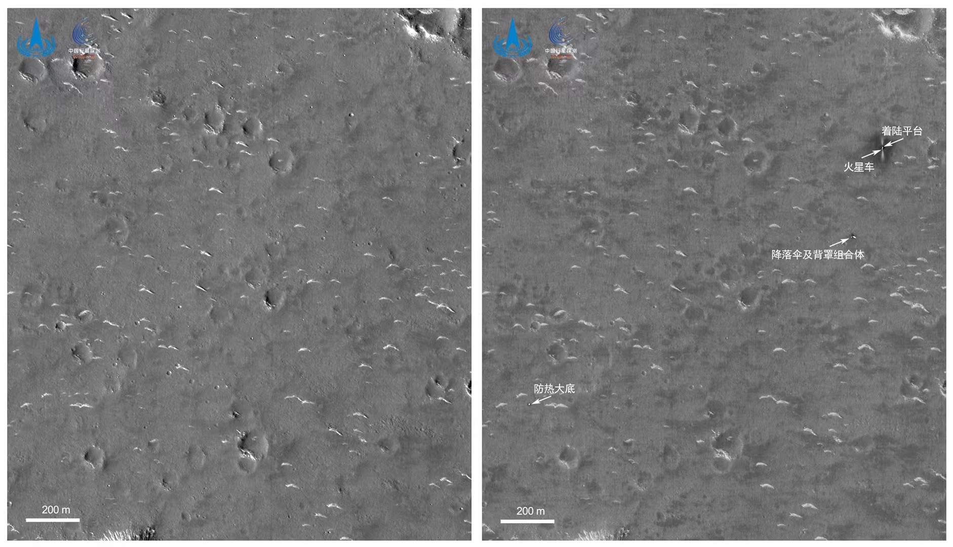 影像圖由天問一號環繞器高分辨率相機,於6月2日18時拍攝。圖像右上角有兩處明顯亮斑,靠上的亮斑由兩個亮點組成,較大亮點為天問一號着陸平台,較小亮點為「祝融號」火星車。