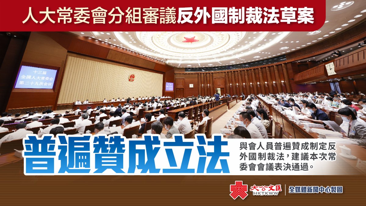 大公文匯全媒體報道,十三屆全國人大常委會第二十九次會議今日(8日)上午舉行分組會議,審議海南自由貿易港法草案、安全生產法修正草案、印花稅法草案、反外國制裁法草案等。與會人員普遍贊成制定反外國制裁法,建議本次常委會會議表決通過。