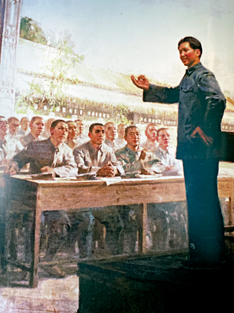 展廳裏的巨幅油畫《毛澤東在講課》(右圖)中,毛澤東眼神堅定,手勢有力,而聽課的學員們也紛紛流露出對未來新中國的憧憬與嚮往。參觀者駐足觀察,似乎也聽到毛澤東當年那「農民問題乃國民革命的中心問題」的鏗鏘有力論斷。