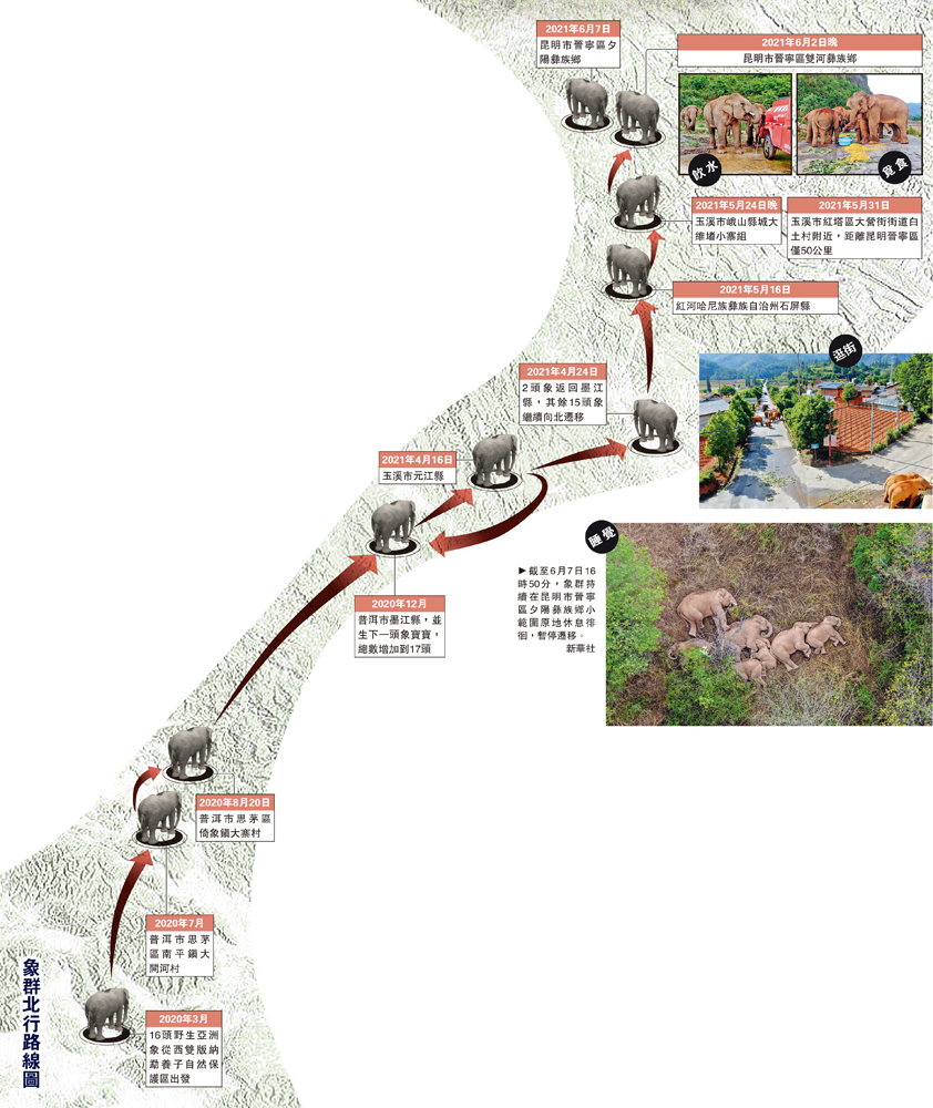 北遷亞洲象群一行17頭離開西雙版納棲息地向北遷徙,途中有2頭象返回了原地。象群一路走過普洱市、紅河州、玉溪市,至6月2日晚間進入昆明,其中成年雌象6頭、雄象3頭、亞成體象3頭、幼象3頭,跨越半個雲南省。