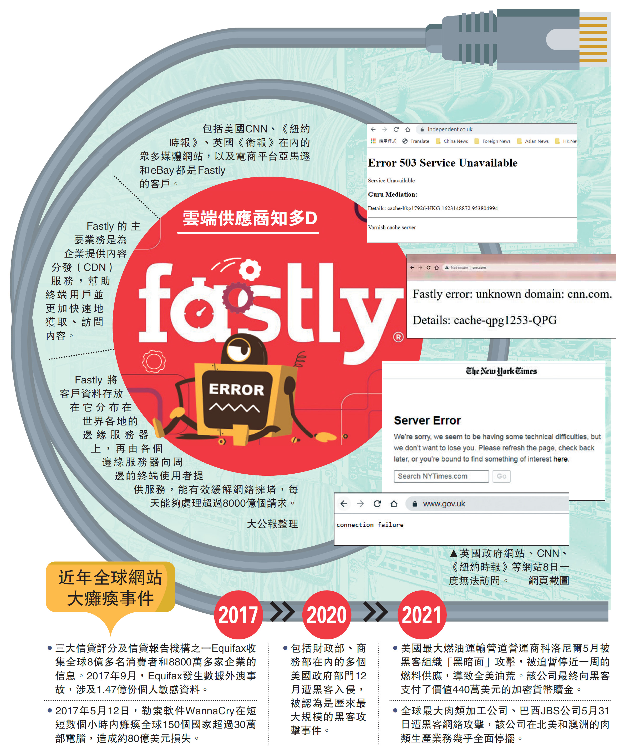 香港大公報綜合美聯社、路透社、《衛報》報道,美國雲端網絡服務供應商Fastly8日突發故障,導致全球多個大型網站集體癱瘓,包括美國白宮網站、英國政府網站、美國有線電視新聞網(CNN)、英國《衛報》網站、交易支付平台PayPal等多個平台均無法訪問。分析指,近來全球網絡攻擊事件頻發,凸顯了當前互聯網架構的高度集中性和脆弱性。互聯網上最受歡迎的網站依賴於某幾家大型科技公司分發內容,一旦發生故障,將導致大面積「死機」。