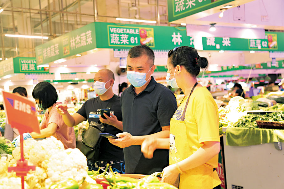 選購完畢,黃繼堅走向自助掃碼結賬區域買單。「疫情期間使用電子支付,能減少大家面對面的接觸。」不過為了方便長者顧客,這裏的市場及超市還是保留一些人工櫃枱。黃繼堅感嘆,在祈福新村住了這麼多年,最安心的就是村內的配套服務,所以就算此次疫情反彈,他也從未擔心過。