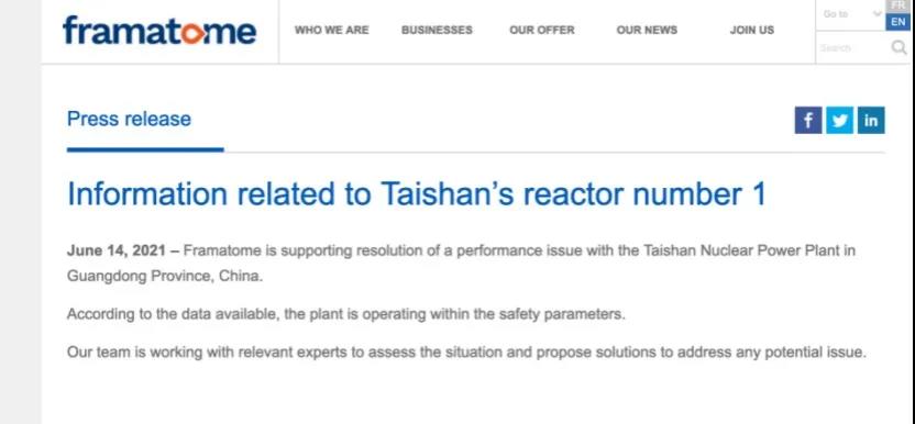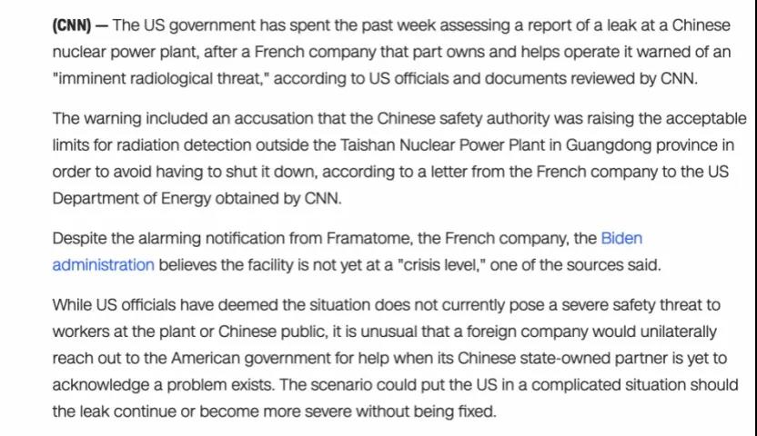 其次, CNN說6月8號法馬通公司 (台山核電站的法國合作方)向美國能源部發信求助,信中提到了「迫在眉睫的放射性威脅」 (imminent radiological threat), 但很快就被打臉,因為6月14日,法馬通公司官網發布聲明說:「正在協助解決廣東省台山核電站的性能問題,根據現有的數據表明,台山核電廠仍在安全許可標準下運作。我們的團隊正在與相關專家合作,以評估情況並提出解決任何潛在問題的方案。」可見,所謂的「放射性威脅」只是美國單方面的臆想。