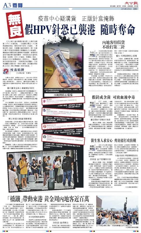 據大公報報道,《大公報》前年獨家揭發本港出現水貨及冒牌HPV疫苗,報道引發社會廣泛關注,亦促使海關與衞生署連番採取行動,從多間疫苗或醫務中心檢獲大批懷疑冒牌疫苗。當中,當局從尖沙咀「加維醫務及疫苗中心」搜獲共154劑懷疑冒牌HPV疫苗,涉案中心一名女董事及一名男醫生、醫務中心均被票控,他們不認罪,昨於九龍城法院受審。
