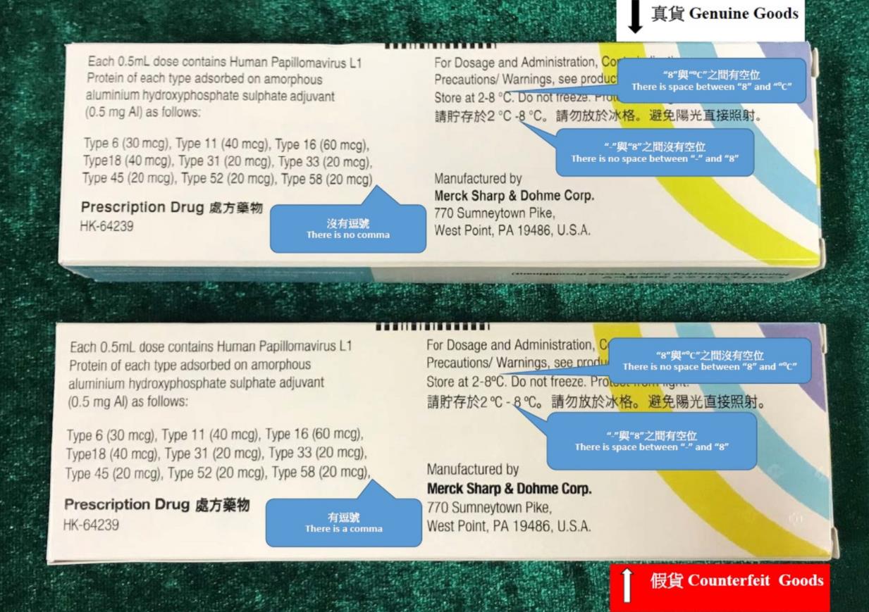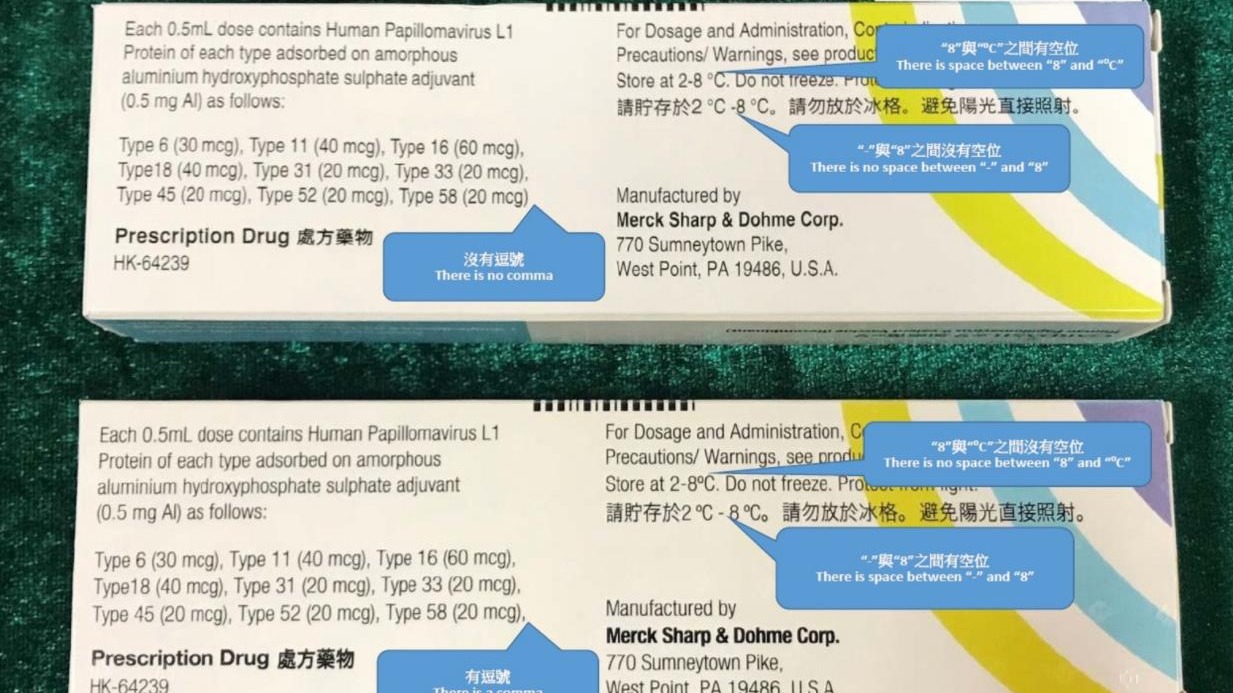 疫苗生產商默沙東藥廠從沒有授權任何人製造疫苗,事後委託了律師行檢驗涉案冒牌貨。該律師行一名職員作供時形容,正牌貨理應是呈奶白色「渾濁」狀,但涉案冒牌疫苗卻透明如清水。此外,涉案冒牌貨在針筒的蓋等位置,沒有印上「BD」字樣商標。