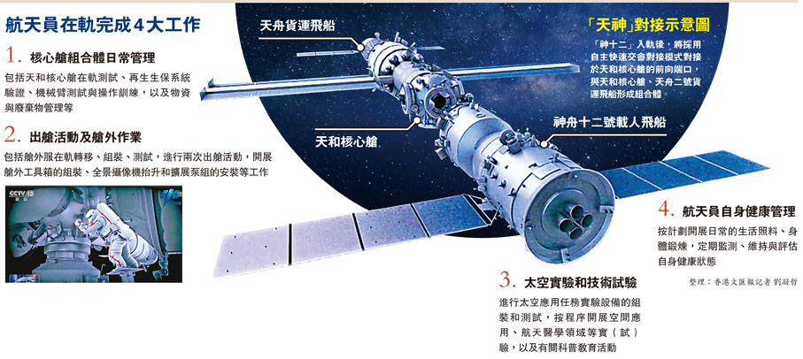 按計劃,神舟十二號飛船入軌後,將採用自主快速交會對接模式對接於天和核心艙的前向端口,與天和核心艙、天舟二號貨運飛船形成組合體。航天員進駐核心艙,執行天地同步作息制度進行工作生活,駐留約3個月後,搭乘飛船返回艙返回東風着陸場。據介紹,天和核心艙提供了3倍於天宮二號太空實驗室的航天員活動空間,配備了3個獨立臥室和1個衞生間,保證航天員日常生活起居。航天食品方面,配置了120餘種營養均衡、品種豐富、口感良好、長保質期的航天食品。