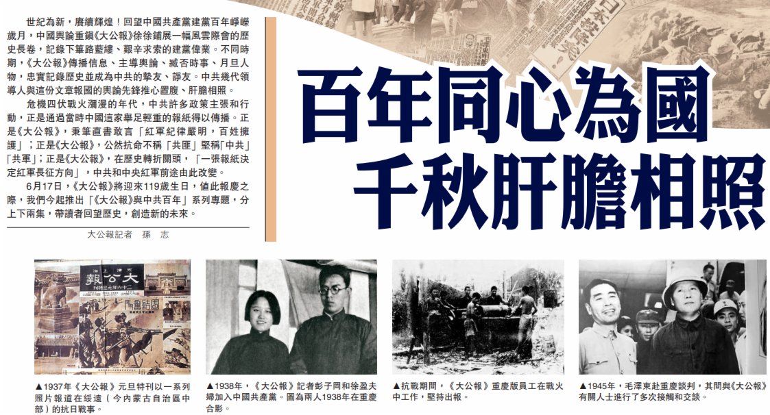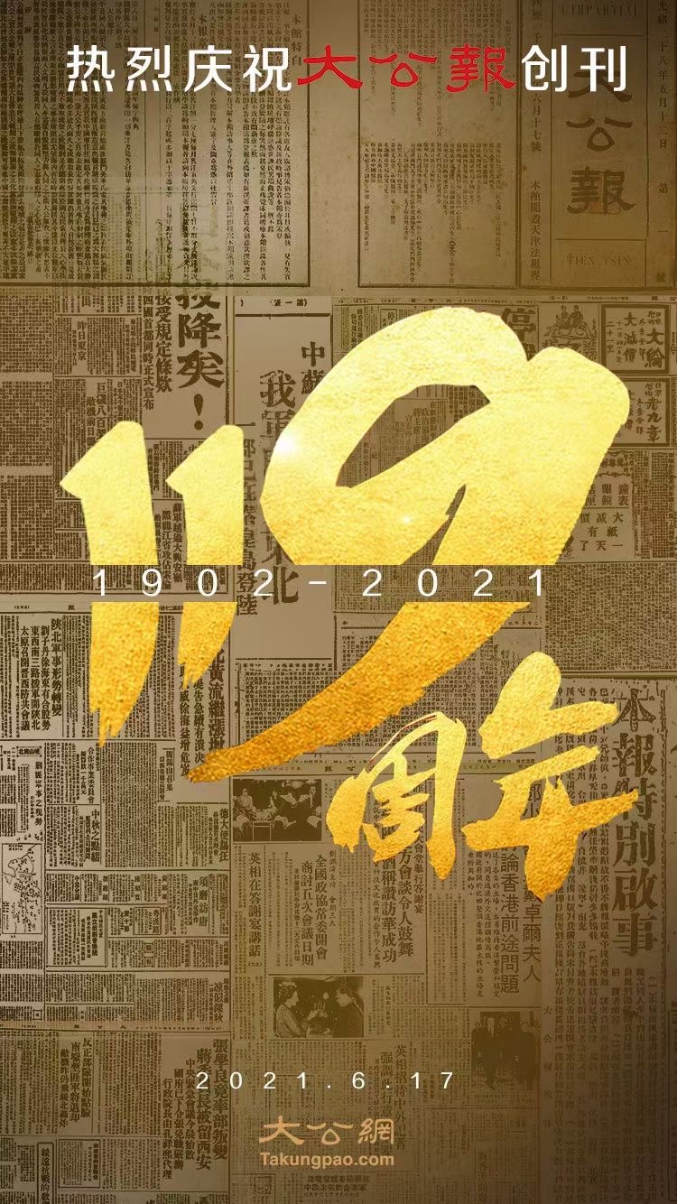 6月17日,《大公報》迎來119歲生日,百年《大公報》,百年風雲史。《大公報》百年的崢嶸歲月伴隨中共百年輝煌歲月,回望歷史,展望未來。大公報在歷史長河沙中瀝金,猶如一面史鏡,映射出民族之殤、正義之光和歷史走向。第一代領導人毛澤東將「為人民服務」書贈大公,是與大公同人「忘己之為大 無私之謂公」新聞理想的契合心照。今日《大公報》,已經成為屹立在維港,代表正義正能量的錚錚之聲的代言者。