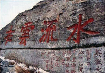 1913年2月,英斂之攜妻兒來到海澱區溫泉鎮,信口吟詠起杜甫的詩:「坦腹江亭暖,長吟野望時。水流心不競,雲在意俱遲。」隨後,英斂之題寫榜書「水流雲在」四字,下面題註:「英斂之偕內子淑仲小兒千里遊此偶取杜句寄意時宣統退位之次年正月也」。