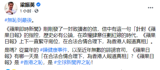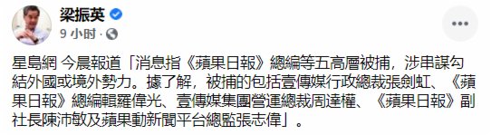 大公文匯網報道,警方國安處今晨(17日)採取行動,拘捕《蘋果日報》董事及高層。警務處國家安全處高級警司李桂華上午見記者時表示,行動今早6點開始,連同刑事部和機動部隊大約500人,針對《蘋果日報》部分董事及高層涉嫌串謀他人對香港特區和中華人民共和國進行制裁進行拘捕。而蘋果即時新聞居然無恥發文:「緊守崗位為香港人報道真相。」全國政協副主席、香港前行政長官梁振英今日在個人社交平台Facebook上連發10貼駁斥:從當年的陳健康事件,以至近年無數的誹謗官司,《蘋果日報》有哪一天是「在合法合情合理下,為香港人報道真相」? 《蘋果日報》是香港之恥,是全球新聞界之恥!梁振英還表示,任何人、任何機構,都沒有凌駕法律的特權,都沒有危害國家安全的特權,更沒有串謀境外勢力的特權。