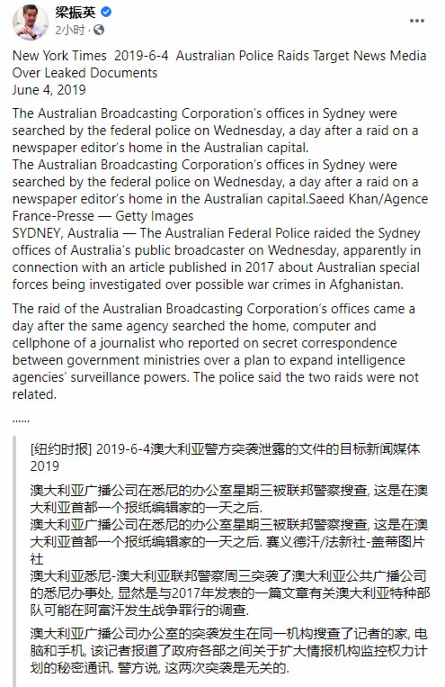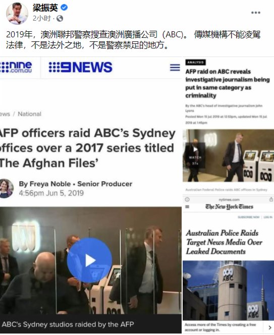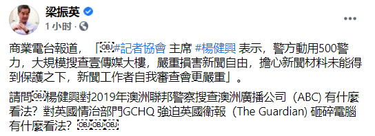 香港記者協會主席楊健興今日宣稱,警方動用500警力,大規模搜查壹傳媒大樓,嚴重損害新聞自由,擔心新聞材料未能得到保護之下,新聞工作者自我審查會更嚴重」。梁振英反問道,請問楊健興對2019年澳洲聯邦警察搜查澳洲廣播公司(ABC) 有什麼看法?對英國情報部門GCHQ 強迫英國衛報(The Guardian) 砸碎電腦有什麼看法?