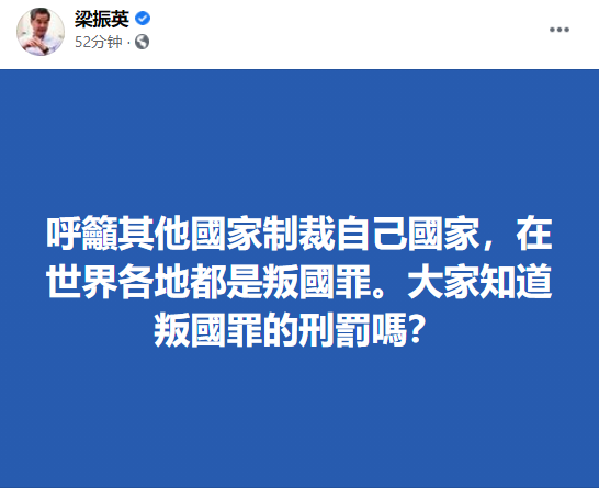 梁振英最後發出靈魂一問:呼籲其他國家制裁自己國家,在世界各地都是叛國罪。大家知道叛國罪的刑罰嗎?