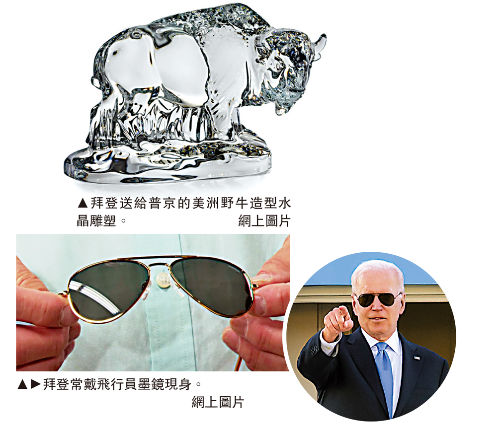 大公報援引《每日郵報》報道:美俄首腦16日在日內瓦首次進行面對面會晤。白宮透露,拜登贈與普京兩份見面禮,第一份禮物是一副定製的飛行員墨鏡,拜登常戴着這款墨鏡出現在鏡頭前。另一份禮物則是一頭美洲野牛造型的水晶雕塑。