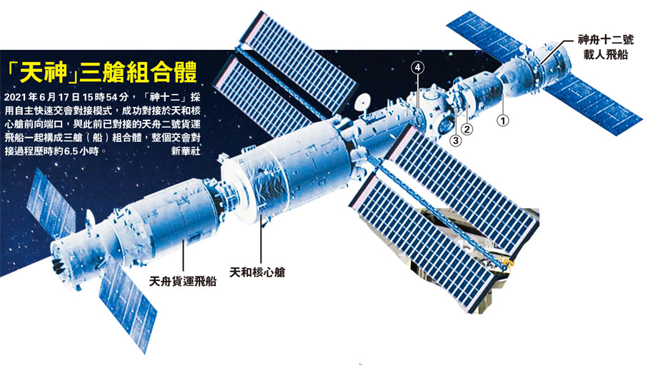 2021年6月17日15時54分,「神十二」採用自主快速交會對接模式,成功對接於天和核心艙前向端口,與此前已對接的天舟二號貨運飛船一起構成三艙(船)組合體,整個交會對接過程歷時約6.5小時。