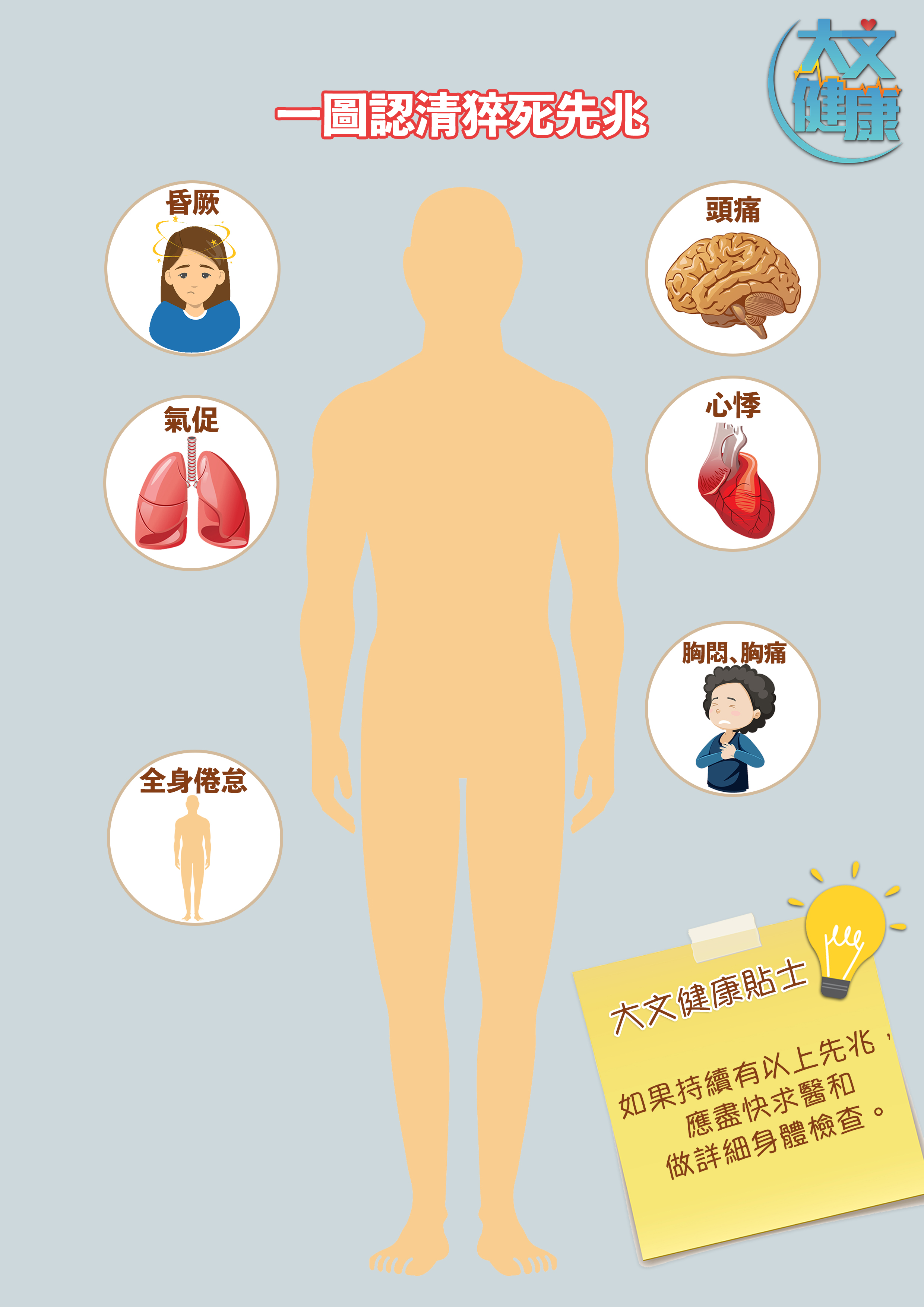 其實有部分個案在猝死前,身體曾發出警號,包括出現氣促、胸悶、胸痛、昏厥、心悸、頭痛、全身倦怠。如果有以上先兆,就應盡快求醫和做詳細的身體檢查,了解自己是否有猝死的風險。