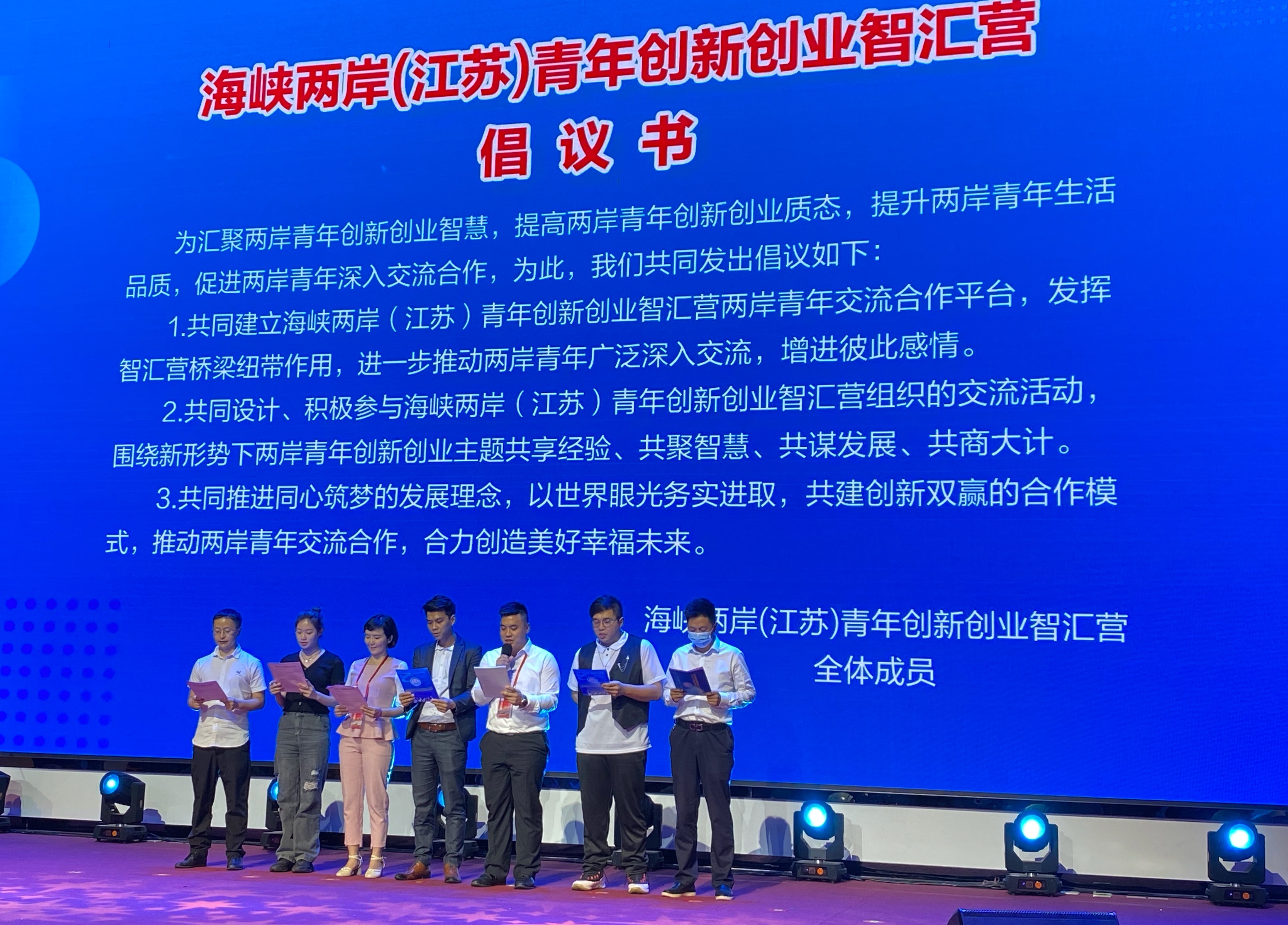 啟動儀式上,兩岸青年代表一同發出「三個共同」的倡議:共同建立海峽兩岸(江蘇)青年創新創業智匯營,進一步推動兩岸青年廣泛深入交流,增進彼此感情;共同設計、積極參與智匯營組織的交流活動,共享經驗、共聚智慧、共謀發展、共商大計;共同推進同心築夢的發展理念,推動兩岸青年交流合作,合力創造美好幸福未來。