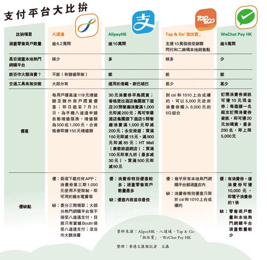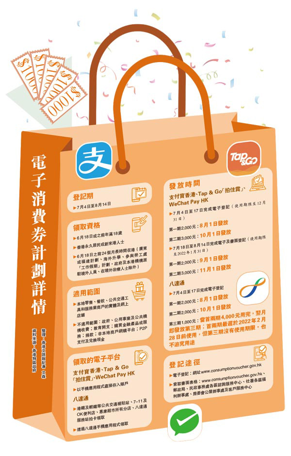 【香港文匯報記者 文森】千呼萬喚的5,000元電子消費券計劃昨日終於公布發放詳情,下月4日開始接受年滿18歲的合資格香港居民登記,最快8月1日領取第一期消費券金額,估計全港720萬人受惠。財政司司長陳茂波在記者會上表示,聽取巿民意見後調整計劃,消費券除適用於本地零售、餐飲及服務消費外,還可用於搭乘公共交通工具。但不同電子支付工具有不同的派錢安排,八達通分三期發放,限時7個月內用完首兩期4,000元,最後一期1,000元消費券則不限用途和使用期限,巿民可以用作交稅、水電煤費用等,其餘三款支付工具則分兩期發放金額。他估計,計劃可以為香港整體經濟帶來0.7%提振作用。