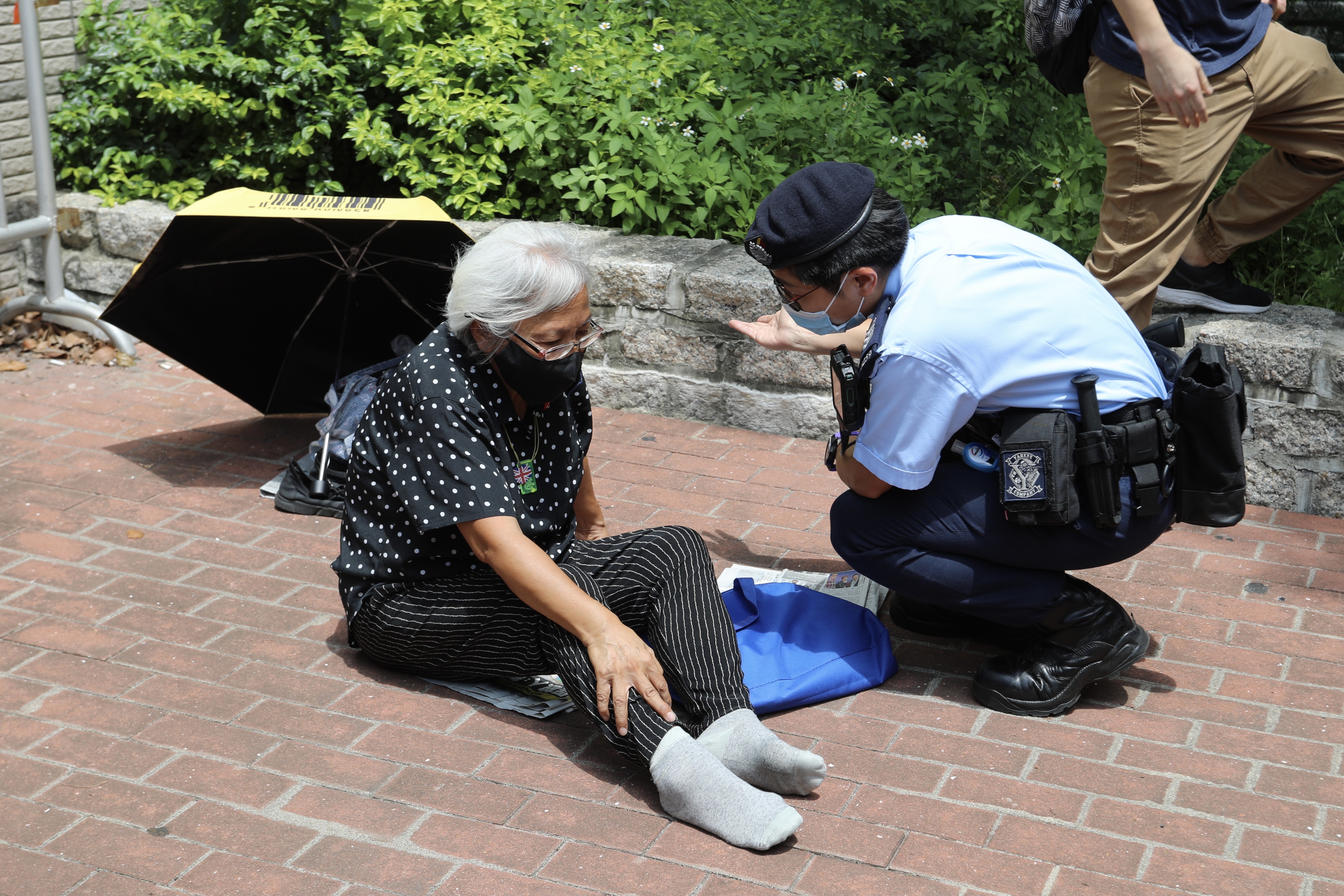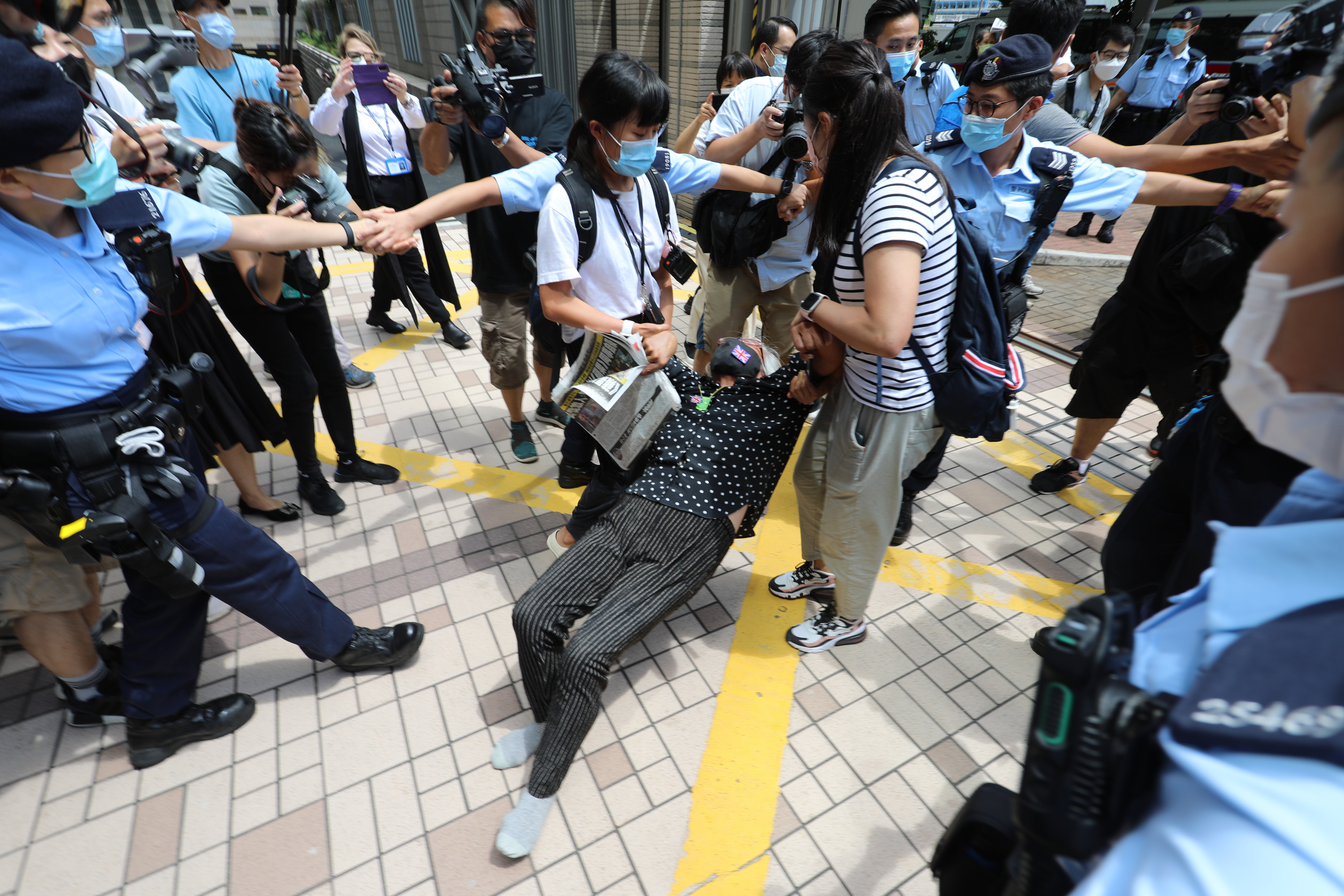 大公文匯全媒體報道:警方國安處前日拘捕《蘋果日報》5名高層,其中壹傳媒行政總裁兼《蘋果日報》社長張劍虹,及總編輯羅偉光被控「串謀勾結外國或者境外勢力危害國家安全罪」,今(19日)早9時許被警車押解到西九龍裁判法院提堂。案件開庭後,經常揮動英國國旗四處招搖的「示威專業戶」、綽號「王婆婆」王鳳瑤,走入西九法院範圍內不停叫囂,保安勸喻她離開,她反而繼續高聲叫囂並辱罵保安,企圖擾亂公共秩序。警員上前勸止,但「王婆」拒絕合作,更企圖倒地耍賴,之後被警方帶往法院門口行人路。