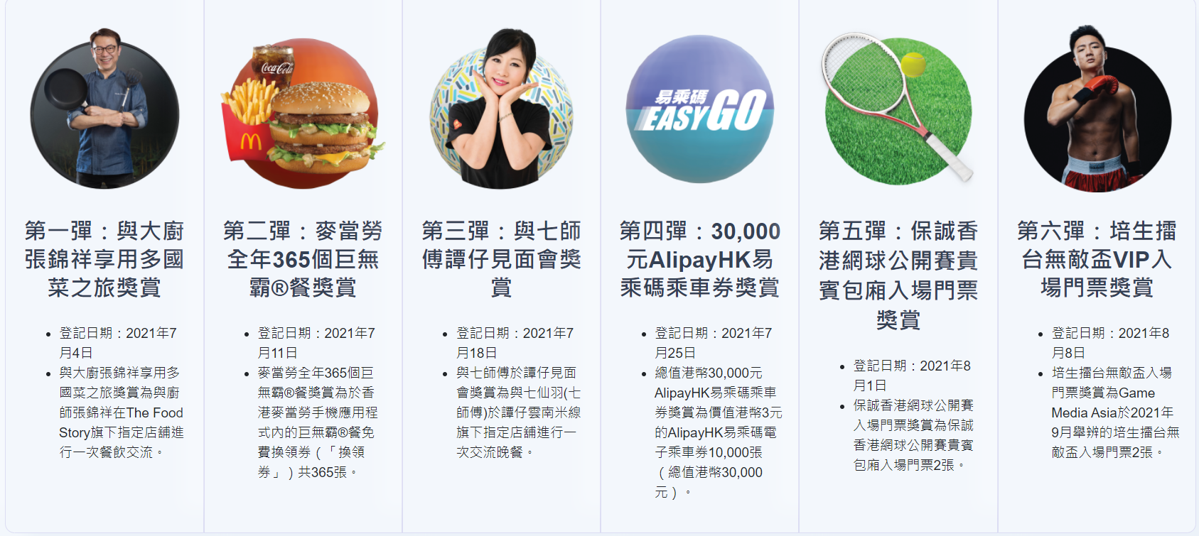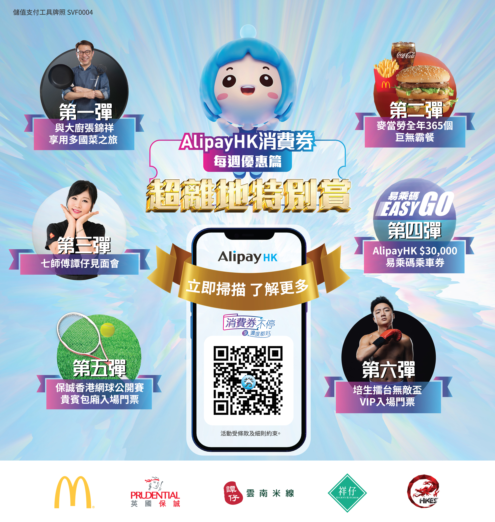 Alipay HK表示,於政府中央登記系統正式接受登記後,Alipay HK將分6個階段推出「超離地特別賞」,每個階段首兩名選用Alipay HK領取消費券的合資格用戶,可獲得非一般名人互動體驗以及娛樂餐飲交通獨特禮遇。獎賞包括與大廚張錦祥享用多國菜之旅、麥當勞全年365個巨無霸餐、與七師傅譚仔見面會、港幣30000元Alipay HK易乘碼乘車券、保誠香港網球公開賽貴賓包廂入場門票及培生擂台無敵盃VIP入場門票套裝。