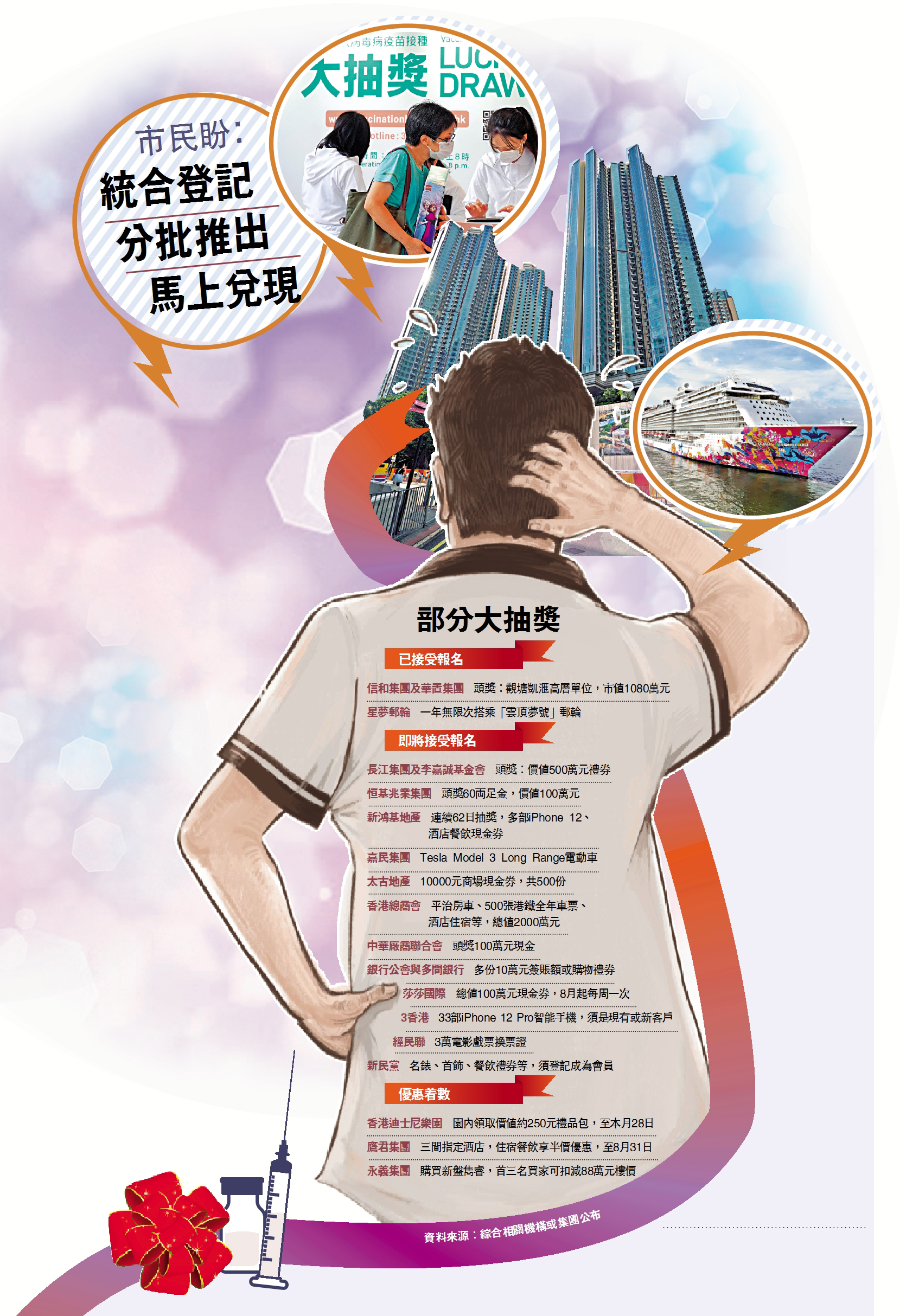 疫苗抽獎活動之多確實令人眼花繚亂。《大公報》記者點算發現,已公布的抽獎活動已超過30個,送出獎品總值超過1.8億元,但暫時只有兩個活動開始接受登記,其餘都是「詳情稍後公布」,最快要到本月底或下月初,待八、九月才公布結果,市民可謂「等到頸都長」。