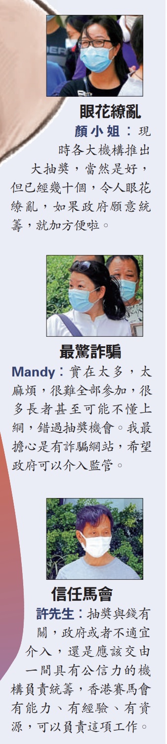 《大公報》記者近日走訪社區疫苗接種中心,了解市民對疫苗大抽獎的意見。綜合而言,普遍市民認同獎品吸引,但須逐一搜尋,到不同主辦單位的網站登記,有人擔心有所遺漏;亦有人擔心誤入黑客的「釣魚網站」陷阱,個人資料外洩;有長者嫌麻煩,決定放棄抽獎;而更多市民認為,應該由政府或具有公信力機構,例如香港賽馬會統籌抽獎。