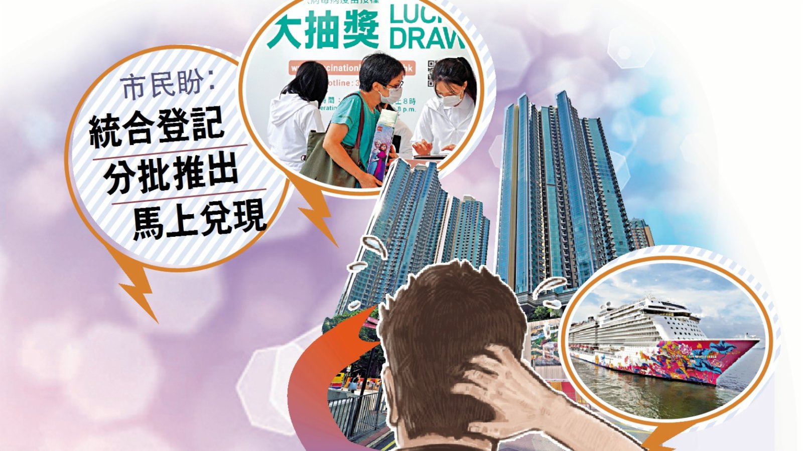 由於抽獎活動同一時段推出,市民另一關注點是希望可以分階段抽獎。以長實集團及李嘉誠基金會的抽獎為例,獎品總值2000萬元,頭獎是價值500萬元禮券,但全部獎品只有36份,估計只有一輪抽獎;香港總商會的抽獎活動,獎品總值3000萬元,包括平治房車、500張港鐵全年免費車票,以及每張不少於1000元的商場禮券等,將會有約5000名得獎者,7月2日開始首次抽獎,之後七輪抽獎,每兩星期舉行一次,就算一次不中,也可自動進入下一輪。