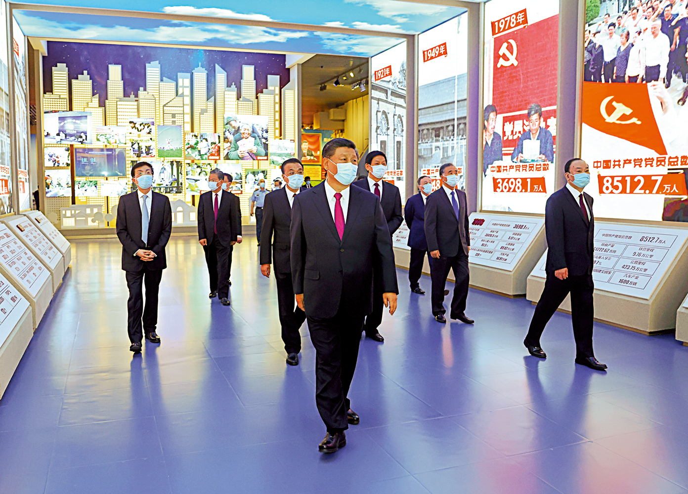 這是創造輝煌開闢未來的一百年。祝融號火星車模型、山東艦航母戰鬥群模型、高鐵復興號模擬駕駛艙……看到中國製造、中國創造、中國建造共同發力,不斷改變中國的面貌,習近平總書記不時點頭。