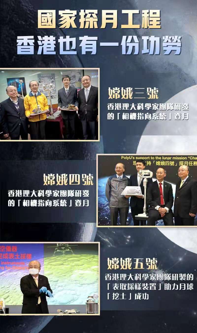 在專訪中,趙小津談到兩地航天合作過程中鮮為人知的故事。他提及,香港理工大學的容啟亮教授團隊,與五院聯合研製了嫦娥三號、嫦娥四號着陸器相機指向機構的輕小型相機雲台,嫦娥五號表取採樣機械臂採樣器、近攝相機和表取初級封裝裝置以及天問一號落火監視相機,都是按時保質完成交付,在軌獲得很好的表現。